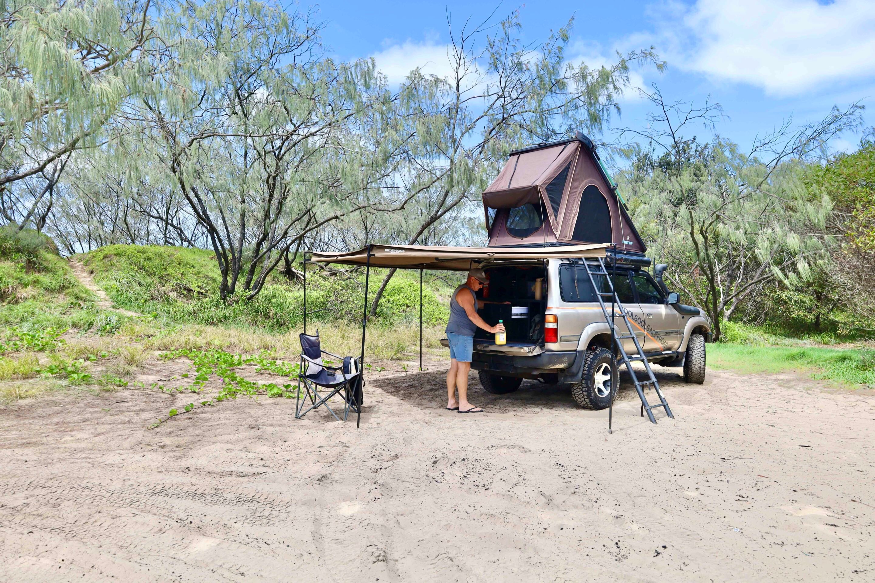 Camping options are spread right across K’gari, including Central Station, but most visitors gravitate to the east coast. I set up in Camping Zone 1, tucked behind a dune to take the sting out of the easterly winds. The only let-down is that fires aren’t permitted anywhere on the island, but the location more than made up for it – just a short stroll over the dune each morning to watch the sunrise and the steady stream of 4×4 traffic racing north and south to meet the barges.