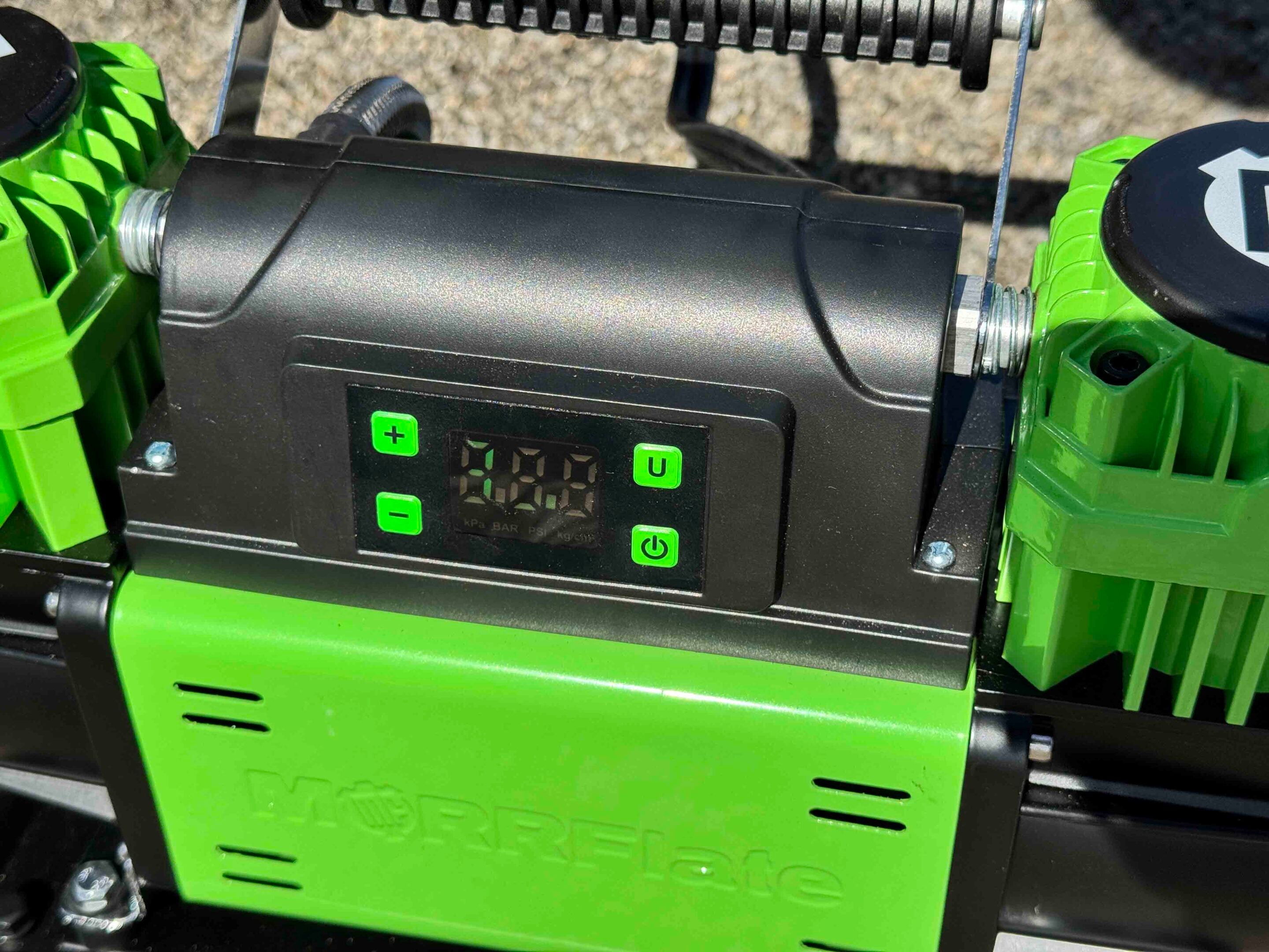 Connecting the air hoses to each tyre is easy and secure, with absolutely no sign of a loose connection or air loss. These air hose kits can also be used with most other air compressors if you already have a set-up like we do in our vehicles. The Australian distributor of this US-made equipment claims the MorrFlate TenSix will inflate four 35-inch tyres from 10 to 40psi in under five minutes. I didn’t measure the time exactly, but I was impressed when the unit inflated four 33-inch tyres from 15 to 45psi in seemingly no time at all. The compressor was relatively quiet during the process and, while warm to the touch after filling eight tyres, wasn’t excessively hot.