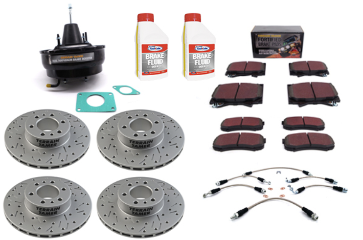 Terrain Tamer’s Fortified Brake Kits combine a Heavy Duty Brake Booster with high-performance rotors, braided hoses and Fortified Brake Pads to improve stopping power and pedal feel.