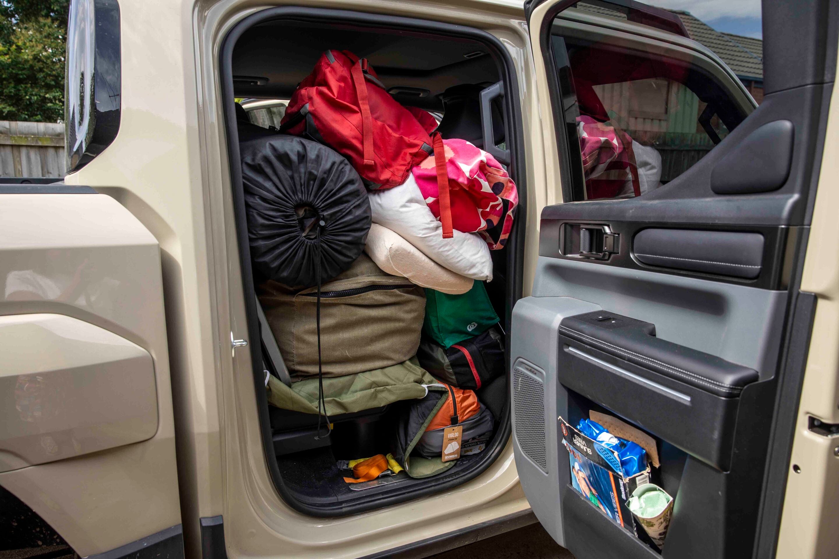 On paper, the Kia’s generous proportions suggested space wouldn’t be an issue. In practice, the absence of a canopy or hard cover complicated matters. Keeping gear secure during city stops was tricky, and even when packed under tarps and straps, the tray contents never felt entirely safe. The workaround became a careful game of Tetris, shifting gear into the back seats at each stop for peace of mind. One practical note for fridge use: the 240-volt plug in the rear centre console needs to be firmly connected before stacking anything on top – a lesson learned the hard way.