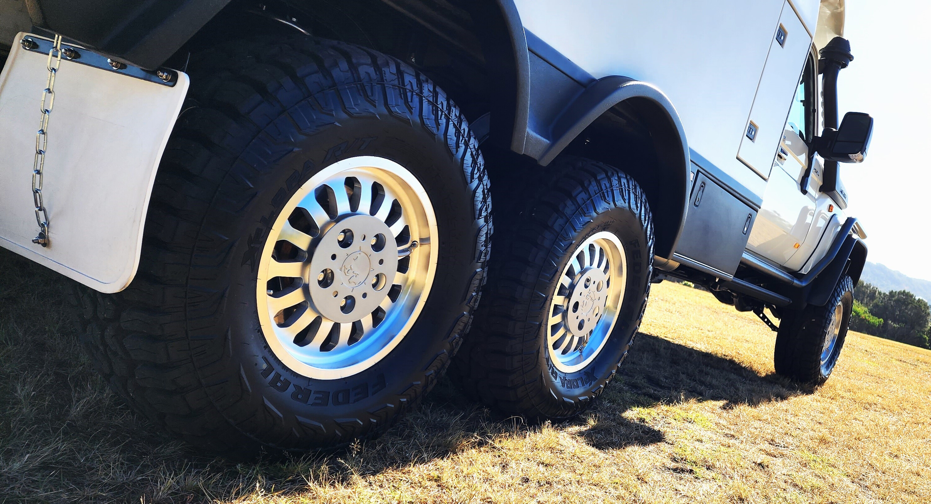 The vehicle is fitted with a drive-through diff and power divider, which allows the third axle to remain undriven on smooth roads but lock up 100-per-cent drive to all wheels should traction stumble. Other attributes of the bogie system include Ford 10- and 9-inch differentials fitted with ARB air lockers, and hardened Chromoly 300M high-strength axles shafts.