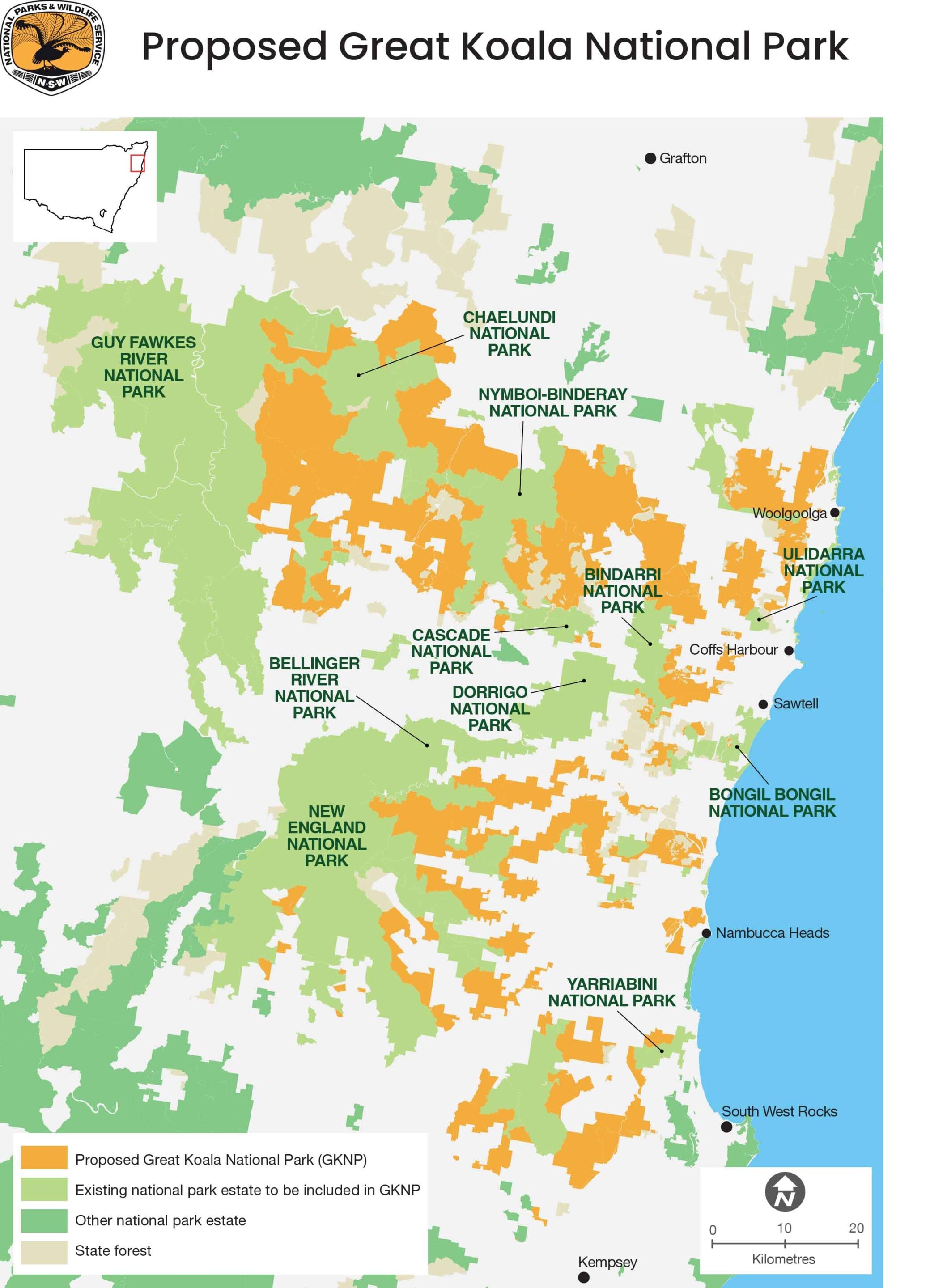 The Great Koala National Park will include multiple reserves, each with rules for what activities are allowed. Covering more than 475,000 hectares from Kempsey to Grafton and inland to Ebor, it will combine existing reserves with 176,000 hectares of new protected land to create connected, high-quality habitat.