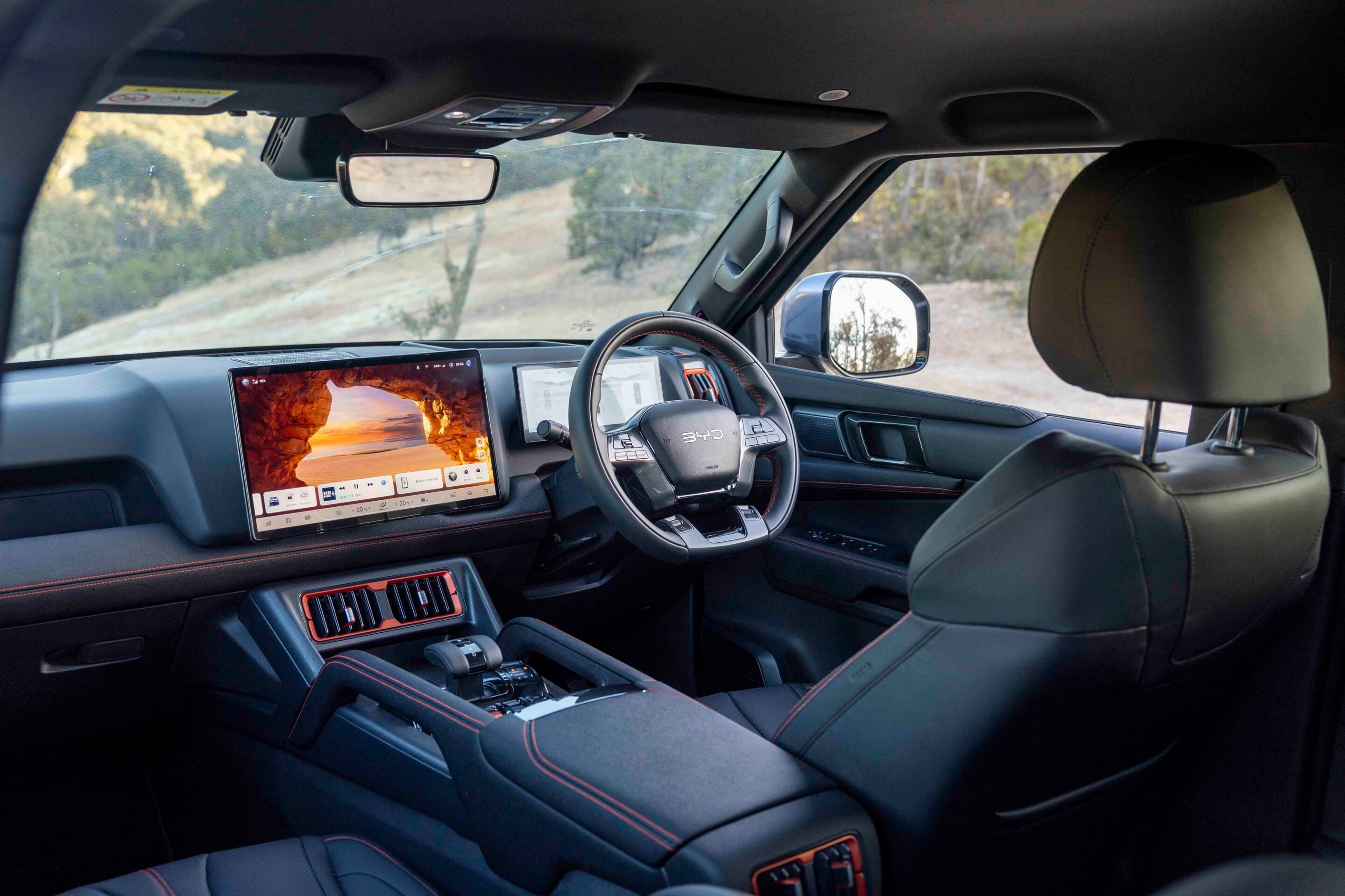 The cabin layout is clean and modern, anchored by BYD’s signature rotating 12.8-inch touchscreen, which can switch between landscape and portrait modes. It houses most vehicle controls – climate, drive modes, camera systems and EV settings – giving the interior a sleek, minimalist feel.