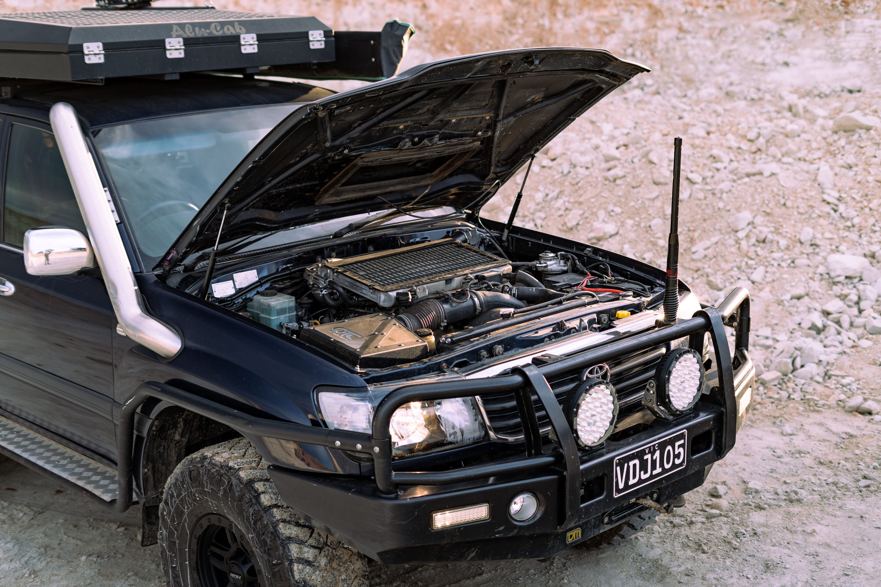 The bonnet was merged to create a factory-looking scoop for the top-mount intercooler. A custom exhaust followed, along with an in-house airbox, ECU and fuse-box brackets, and a reworked fuel system. The dash was rewired, the cluster modified and everything clicked together like it had always belonged there. With the fundamentals sorted, the 105 received its first wave of upgrades: HARROP E-lockers, Dobinsons springs and shocks, a TJM bar and winch, STEDI Type-X Pros, 35s, a tidy rear bar and a simple but functional drawer setup.