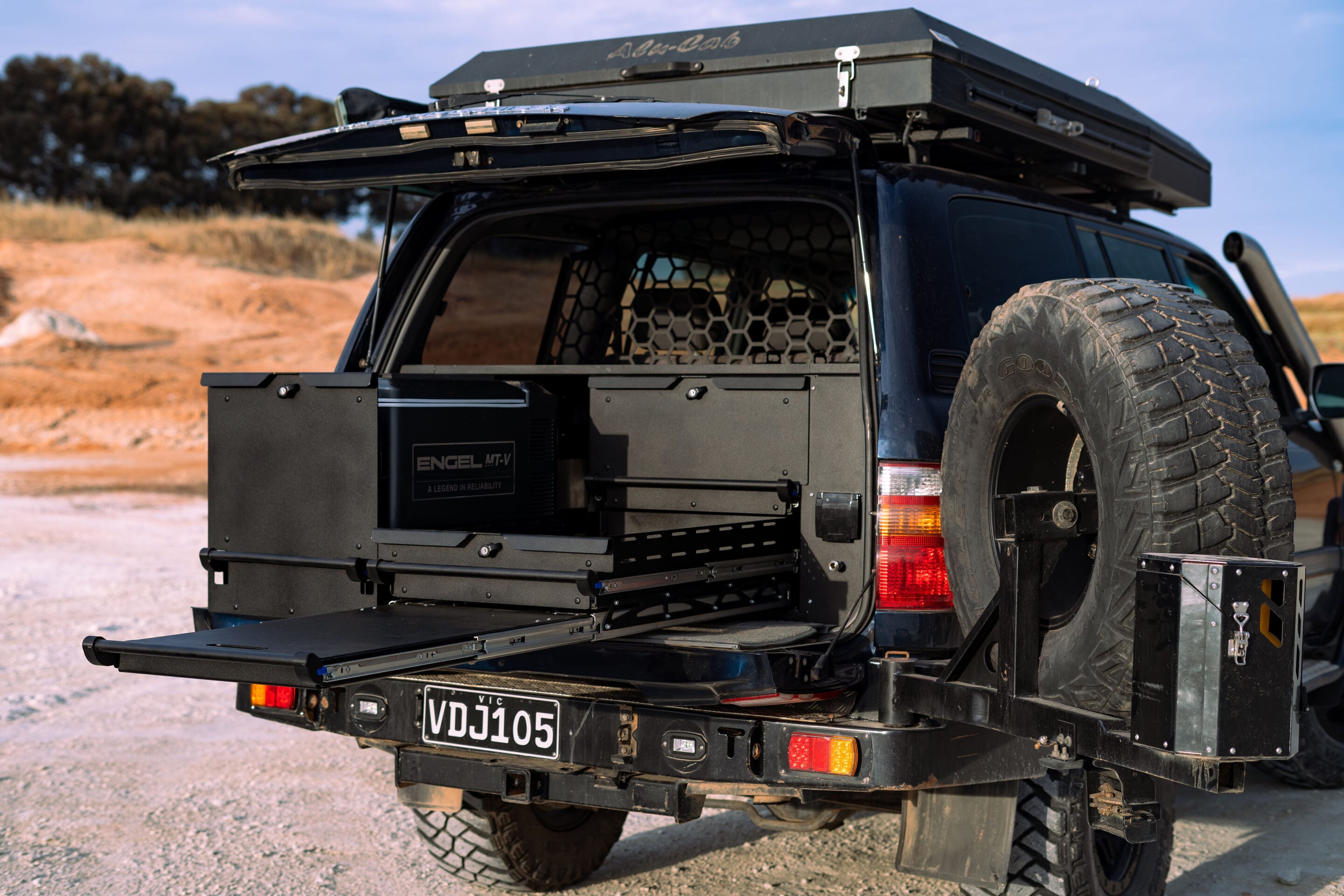 From there the 105 saw mud, snow, sand and everything in between. And when lock-downs hit, the downtime became development time. This was the period where the fabrication style OTC is now known for truly took shape. In 2022, the rough early drawers were ripped out and replaced with a next-level touring system – router-cut, perfectly finished and integrated with an upright fridge, compressor, hot-water setup and a full 12V lithium install. The systems were getting sharper, the finish cleaner and OTC’s identity was forming fast.