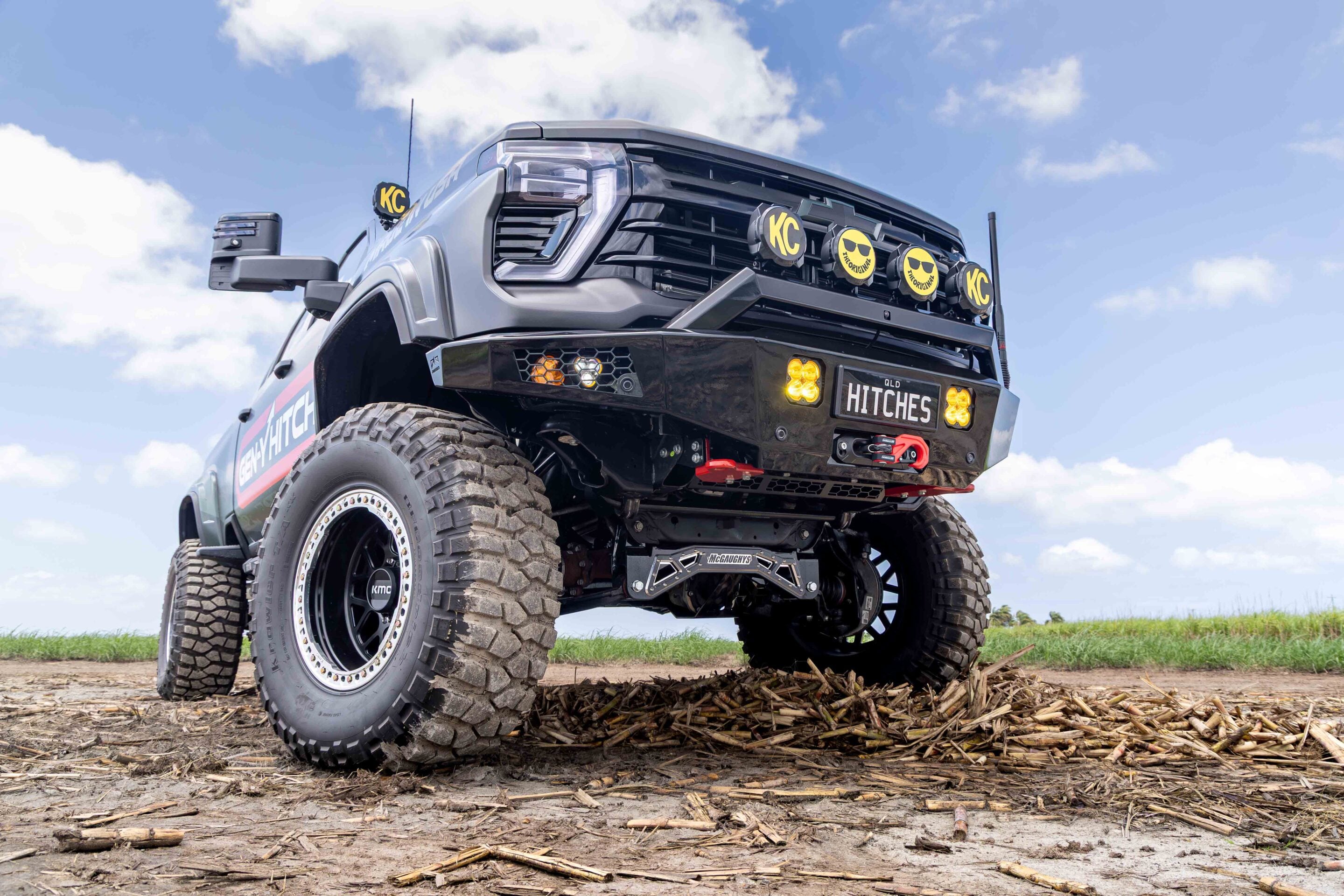 Another Rugged USA Imports brand is KC HiLites, so of course the Chev wears the iconic lighting brand throughout. Up front, the bullbar carries a quartet of Gravity Titan dual-colour lights, with a pair of Flex Era 4 lamps straddling the number plate and Flex Era 3 units tucked into the outer wings of the bar. Underneath, additional KC HiLites rock and glow lights complete the package.