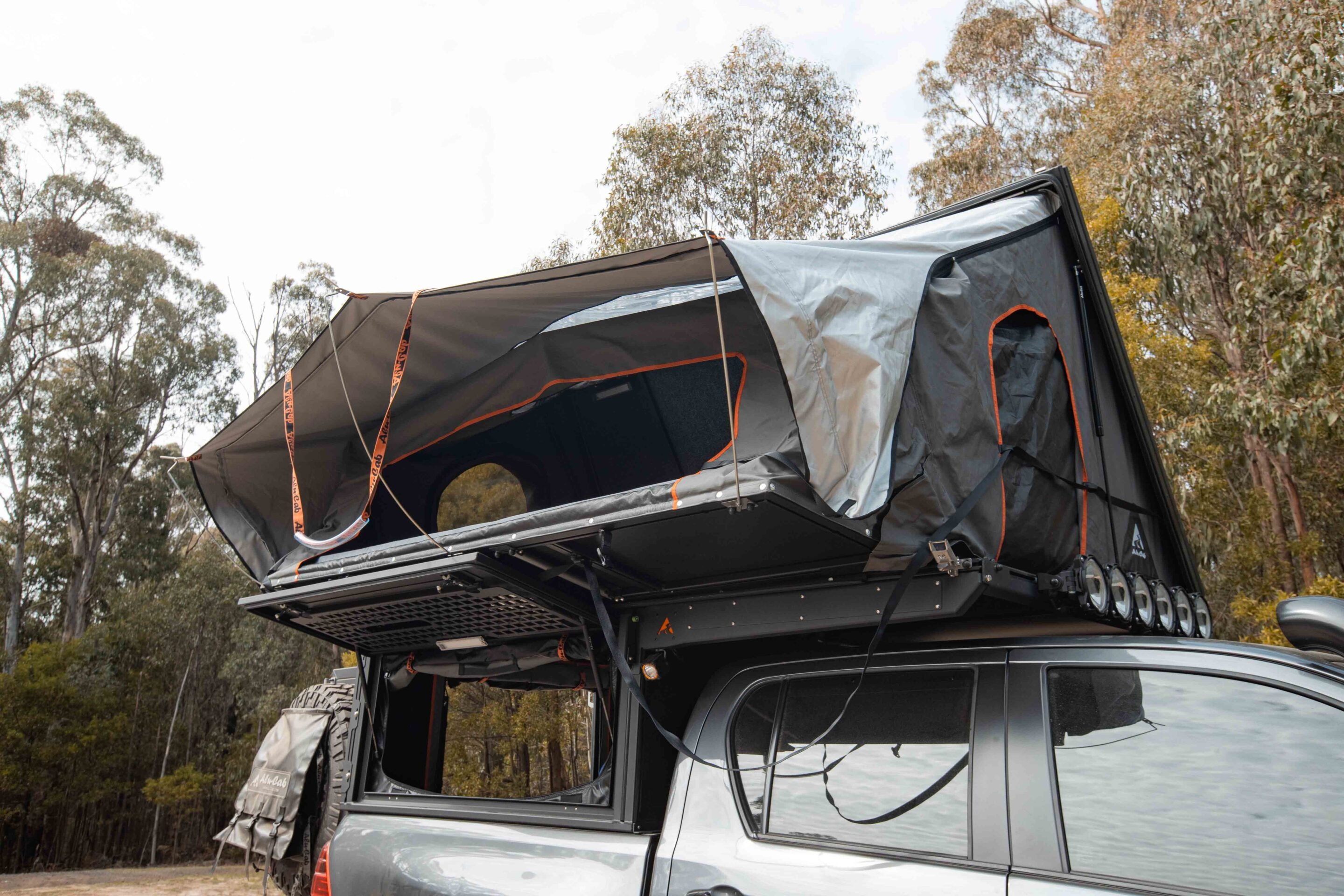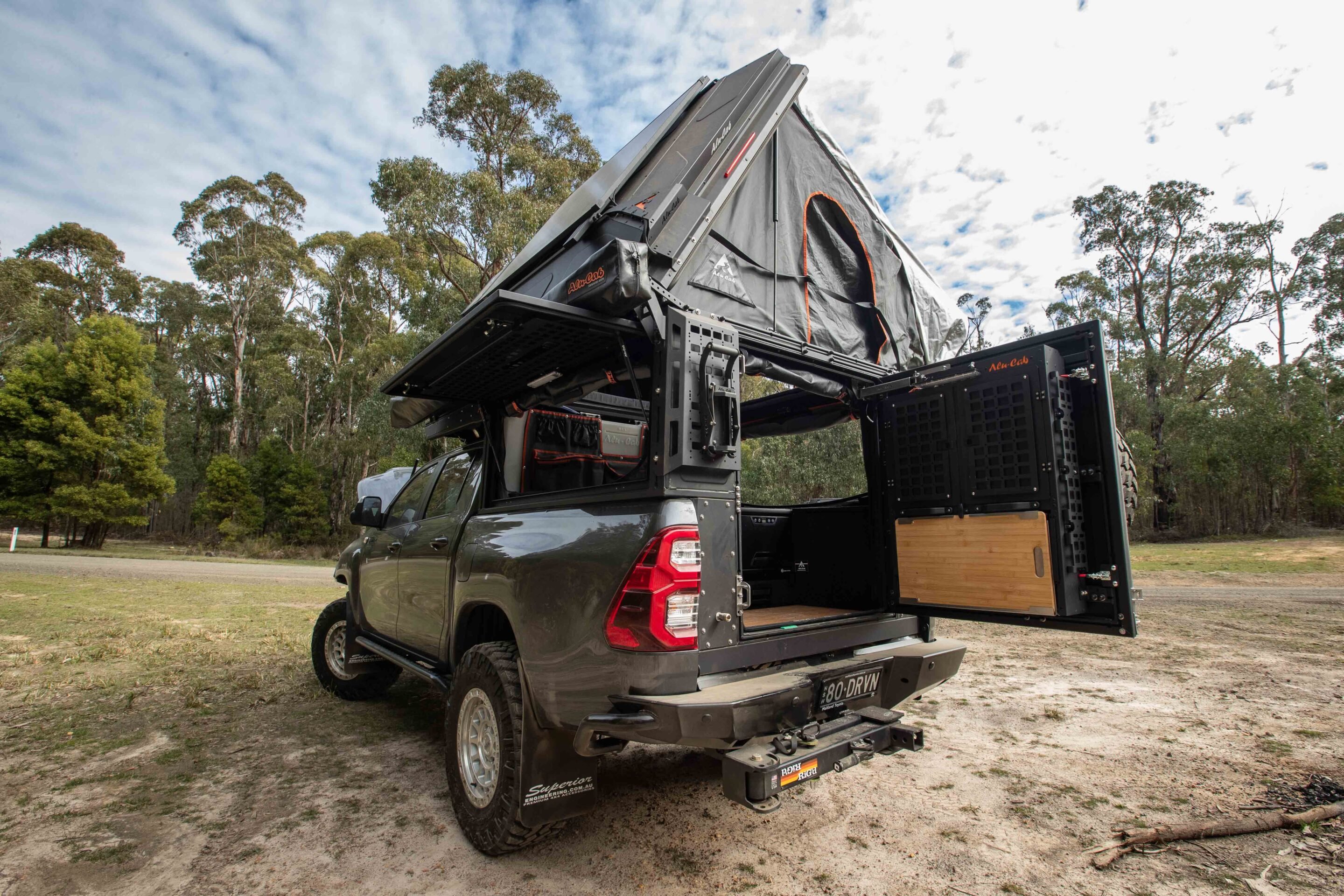 Camping Features | Full standing height, rear galley kitchen, stainless bench, 2 x 30L drawer systems, 60L water tank, MOLLE panel integration, 360-degree ventilation with mozzie mesh |